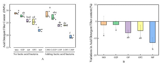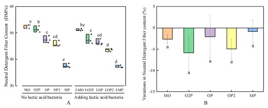 From Figure 6A and Figure 7A, in the group without the addition of LAB, the ADF content of O2P, OP, and OP2 was significantly lower than that of MO, with a decrease of 3.86%, 10.69%, and 11.88%, respectively. The NDF content of OP and OP2 was significantly lower than that of MO, with a decrease of 9.6% and 12.7%, respectively. The addition of LAB significantly reduced ADF content by 6.8%, 5.6%, and 12.6% (p < 0.05) in LOP, LOP2, and LMP, respectively, compared to OP, OP2, and MP. The change in ADF and NDF content was less than 0 (in both ADF and NDF content) when LAB was added compared to the group without LAB, i.e., both ADF and NDF contents were reduced by the addition of LAB to the silage (Figure 6B and Figure 7B).