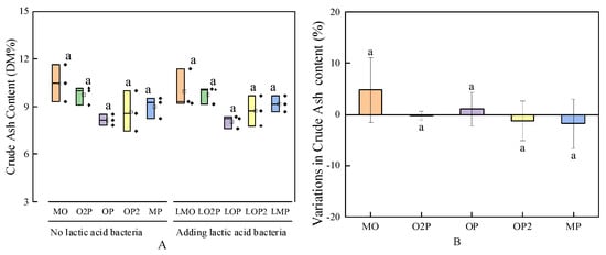 From Figure 8A, there was no significant difference in ash content under each treatment, and there was no significant difference in the variation in ash content in each the treatment for group with LAB addition compared to the group without LAB addition (Figure 7B).