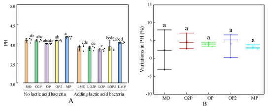 Effect of different mixed cropping ratios of oats and peas and lactic acid bacteria (LAB) additives on the pH of silage (A) and variations in pH value of the silage with added LAB compared to that without LAB at the end of the fermentation (B). Mean values in columns marked with the same letters do not differ significantly (p < 0.05). MO, O2P, OP, OP2, and MP represent oat–pea mixed cropping ratios of 1:0, 2:1, 1:1, 1:2, and 0:1, and the series is the silage treatment without lactic acid bacteria; the L series is the silage treatment with the addition of lactic acid bacteria (same as below).