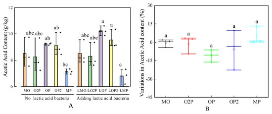 Effect of different mixed cropping ratios of oats and peas and lactic acid bacteria (LAB) additives on the crude acetic acid (AA) content of silage (A) and variations in AA content for that with starter added LAB at the end of the fermentation (B). Mean values in columns marked with the same letters do not differ significantly (p < 0.05). MO, O2P, OP, OP2, and MP represent oat–pea mixed cropping ratios of 1:0, 2:1, 1:1, 1:2, and 0:1, and the series is the silage treatment without lactic acid bacteria; the L series is the silage treatment with the addition of lactic acid bacteria (same as below).