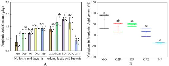 Effect of different mixed cropping ratios of oats and peas and lactic acid bacteria (LAB) additives on the propionic acid (PA) content of silage (A) and variations in PA content for that with added LAB compared to that without added LAB at the end of the fermentation (B). Mean values in columns marked with the same letters do not differ significantly (p < 0.05). MO, O2P, OP, OP2, and MP represent oat–pea mixed cropping ratios of 1:0, 2:1, 1:1, 1:2, and 0:1, and the series is the silage treatment without lactic acid bacteria; the L series is the silage treatment with the addition of lactic acid bacteria (same as below).