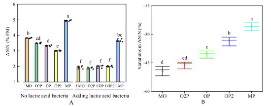 The magnitude of changes in pH (Figure 9B), LA (Figure 10B), and AA (Figure 11B) were not significantly different between the mixed cropping treatment groups with the addition of LAB compared to those without LAB. The magnitude of changes in PA content was significantly greater in the MO fraction than in the MP fraction (Figure 12B). The magnitude of changes in the AN/N variation of the mixed cropping proportions of OP2 and MP was significantly higher than MO, O2P, and OP proportions, and AN/N variation was significantly lower in the MO proportion than the OP proportion (Figure 13B). The results suggest that the OP/MP ratio had a greater impact on the trait than the MO ratio (p < 0.05).