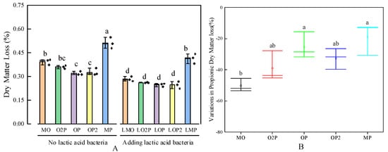 Effect of different mixed cropping ratios of oats and peas and lactic acid bacteria (LAB) additives on the ratio of dry matter loss (DML) of silage (A) and DML variations in AN/N for that with added LAB compared to that without added LAB at the end of the fermentation (B). Mean values in columns marked with the same letters do not differ significantly (p < 0.05). MO, O2P, OP, OP2, and MP represent oat–pea mixed cropping ratios of 1:0, 2:1, 1:1, 1:2, and 0:1, and the series is the silage treatment without lactic acid bacteria; the L series is the silage treatment with the addition of lactic acid bacteria (same as below).