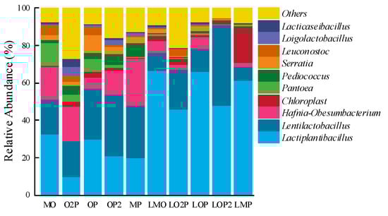 From Table 4, in the group without lactic acid bacteria, MO had strong sour flavor and complete structure; O2P, OP, and OP2 had a weak aromatic flavor; O2P’s structure was complete; OP and OP2’s structures were slightly damaged; and MP had strong aromatic flavor and obvious damage to the structure. In the LAB addition group, LMO had a strong sour flavor and structural integrity; LO2P had a weak aromatic flavor and structural integrity; and LOP, LOP2, and LMP had a strong aromatic flavor, structural integrity, and the best silage quality. The LAB addition group had relatively stronger aromatic flavor and more structural integrity compared to the treatment without LAB addition.