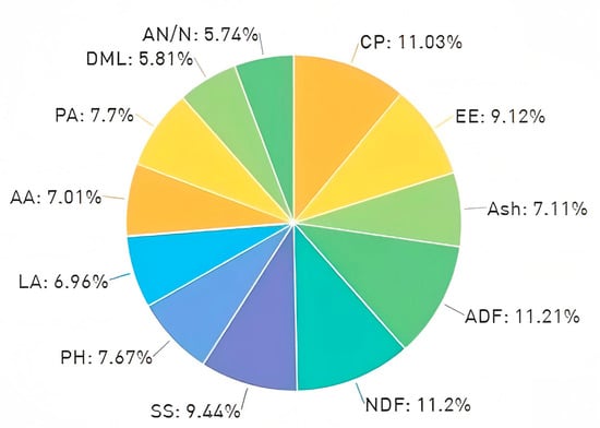 The silage samples were collected and placed in a constant temperature blast dryer at 70 °C until constant weight, pulverized, and mixed well for the determination of nutritional indexes. Crude protein (CP) was determined using the Kjeldahl method (DIN EN ISO 20483:2013 []) []. Ether extract (EE) was determined using the Soxhlet extraction method (ISO 659:1998 []) []. The acid detergent fiber (ADF) and neutral detergent fiber (NDF) contents were determined using the Van Soest method (ISO 13906:2008 []) []. Soluble sugar (SS) was determined according to Xi Weng’s method []. Crude ash was determined using the official AOAC method 942.05 (ISO 5984:2022 []) [].