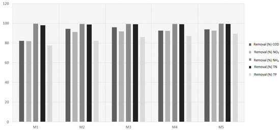 COD removal is a critical parameter in wastewater treatment. In this study, COD removal efficiencies ranged from 82.14% to 95.78%. This indicates that the groups were successful in achieving effective COD removal. Nitrogen pollution in soil poses significant threats in terms of water pollution, eutrophication, reduced soil fertility, and health risks. For instance, an excessive nitrate load in soil can leach into groundwater and surface water, contaminating drinking water sources. Consequently, it can lead to severe health issues, such as the blue baby syndrome in infants and an increased cancer risk in adults. These problems can be mitigated through environmentally friendly methods. This study investigated nitrate removal efficiencies, achieving values ranging between 82% and 92.4%. High ammonium concentrations increase soil salinity and cause damage to plant roots. Ammonium can also leach into groundwater and surface water, leading to water pollution and negatively affecting aquatic ecosystems. Since methods such as biological nitrogen removal are recommended for ammonium reduction, microalgae were utilized in this study. According to the results of the present study, 99% ammonium removal was observed in all the groups, which indicates that all the groups performed successfully. High levels of total nitrogen (TN) and total phosphorus (TP) may cause soil and water pollution, resulting in a decline in oxygen levels in water resources and harming aquatic ecosystems. From a soil fertility perspective, it might bring about negative impacts such as increased salinity. Biological methods are recommended to improve TN and TP levels. In this study, TN and TP removal efficiencies were determined to range between 98–99.4% and 77.4–89.4%, respectively (Figure 4). In a study on agricultural-industrial wastewater-microalgae, the parameters of COD, NH4-N, and NO3-N were examined in a canal-type pond reactor. A removal efficiency of 61.8% was achieved for COD, 67% for NH4-N, and 17.22% for NO3-N [23]. In another study on agricultural-industrial wastewater-microalgae, research was conducted using two different doses, and COD removal was determined to be between 73% and 94.9%. The rate of TN removal ranged from 30% to 48%, while TP removal values were reported between 1.1% and 47.2%. For NH4-N removal, values between 68.5% and 72.7% were observed, and NO3-N removal was stated to range between 17.6% and 19.6% [26].
