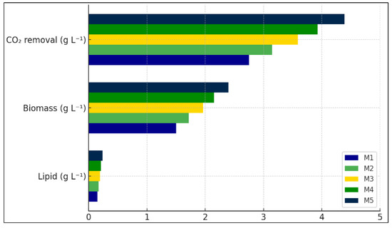 In this study, the primary purpose of the applications was to obtain biomass by ensuring the development of microalgae existing in BLD environments and, thus, microalgae growth. Afterwards, it aimed to determine their biodiesel potential. In this context, biomass yields between 1.5 g L−1 and 2.4 g L−1 were recorded at five different BLD environments. The highest biomass yield was determined in M5. In direct proportion to the biomass data, CO2 removal values were similar. CO2 removal values were calculated between 2.75 g L−1 and 4.39 g L−1 (Figure 5).