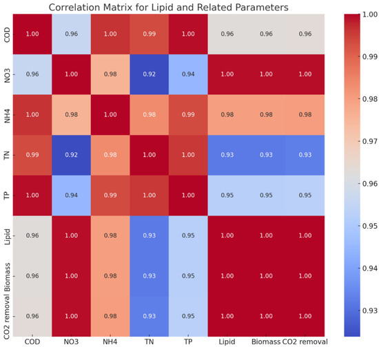 There is a perfect positive correlation (1.00) between lipid, biomass, and CO2 removal. This indicates that as microalgae biomass increases, lipid production and carbon removal also increase. Lipid has a strong positive correlation with COD (0.96), demonstrating that organic matter in the environment is critical for microalgae growth and lipid production. There is also a perfect positive correlation (1.00) between biomass and CO2 removal, indicating that the higher the microalgae biomass, the greater the CO2 removal. Lipid exhibits strong positive correlations with these parameters, ranging from 0.93 to 0.98. This highlights the significant role of nutrients such as NO3, NH4, TN, and TP in lipid production. TP emerges as an important factor for both lipid production and biomass growth (0.95).