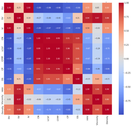 HHV values, which express the amount of energy released by fuel during combustion and are a vital criterion for the energy efficiency and performance of biodiesel, were also investigated. HHV directly affects engine efficiency, fuel economy, and energy output. The HHV of biodiesel is generally about 10% lower than that of petrodiesel, a factor that should be considered in the design of fuel. The correlation matrix of the predicted biodiesel properties is shown in Figure 7.