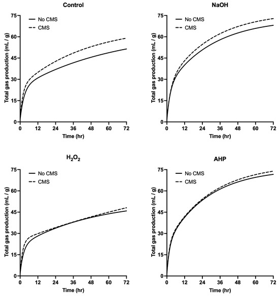 Effect of CMS supplementation on total gas production pattern of Pleurotus eryngii SMS after different chemical treatments for 4 days. No CMS: without CMS supplementation; CMS: supplementation of CMS at 5% DM; NaOH: final concentration at 5% DM; H2O2: final concentration at 3.5% DM; AHP: (NaOH + H2O2) treatment.