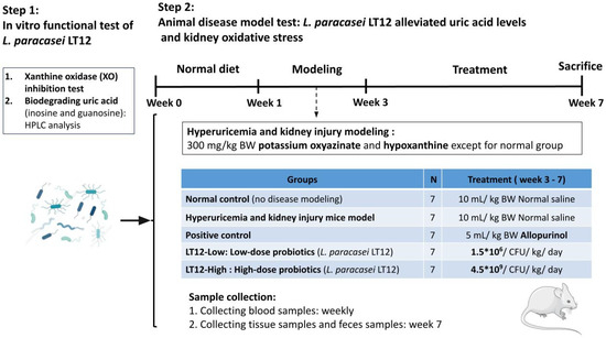 The modeling period lasted two weeks, followed by a four-week intervention period. During the modeling phase, all groups except the normal control group were gavaged daily with 300 mg/kg potassium oxonate (TCI, Shanghai, China) and hypoxanthine (prepared in 0.5% CMC-Na solution; TCI, Shanghai, China). The normal and model groups received an equivalent dose of normal saline. From the third week, the probiotics were administered orally according to the groups shown in Figure 1. Five groups (n = 7 per group) were included: normal control, model control, positive control (5 mg/kg allopurinol, Guangdong P.D. Pharmaceutical Co., Ltd., Kaiping,, China), low-dose LT12 (1.5 × 106 CFU/kg), and high-dose LT12 (4.5 × 109 CFU/kg). All experiments were approved by the Institutional Animal Care and Use Committee (IACUC) of the Animal Ethics Committee of East China University of Science and Technology (License Number: 2012SK001) and adhered to ARRIVE guidelines.