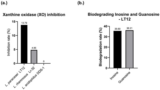 Three Lactobacillus strains were evaluated using an in vitro xanthine oxidase (XO) inhibition assay. Among these, L. paracasei LT12, L. rhamnosus Lr-32, and L. acidophilus DDS-1 demonstrated XO inhibition activities of 13.79%, 4.85%, and 0%, respectively (Figure 2a). Based on these results, L. paracasei LT12 was selected for further testing of its degradation ability on purine metabolites (inosine and guanosine), both of which play a role in uric acid metabolism (Figure 2b). L. paracasei LT12 exhibited the ability to degrade 35.6% of inosine and 36.21% of guanosine.