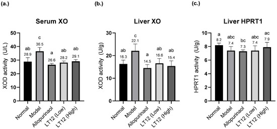 Effects of L. paracasei LT12 on serum XO activity (a), liver XO activity (b), and HPRT1 activity (c) in a hyperuricemia mouse model. The t-test with post hoc Tukey revealed statistically significant differences between groups, as indicated by different letters assigned to each group. Treatments sharing the same letter are not significantly different.