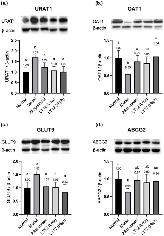 Regulation of renal uric acid transport proteins by L. paracasei LT12 in a hyperuricemia mouse model: URAT1 (a), OAT1 (b), GLUT9 (c), and ABCG2 (d). The t-test with post hoc Tukey revealed statistically significant differences between groups, as indicated by different letters assigned to each group. Treatments sharing the same letter are not significantly different.