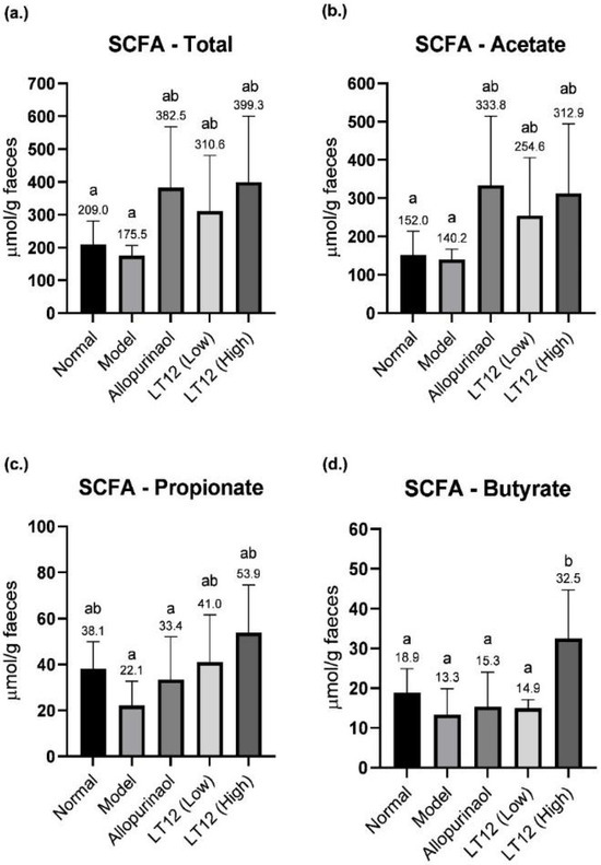 Effects of L. paracasei LT12 on intestinal SCFAs: total SCFAs (a), acetate (b), propionate (c), and butyrate (d). The t-test with post hoc Tukey revealed statistically significant differences between groups, as indicated by different letters assigned to each group. Treatments sharing the same letter are not significantly different.