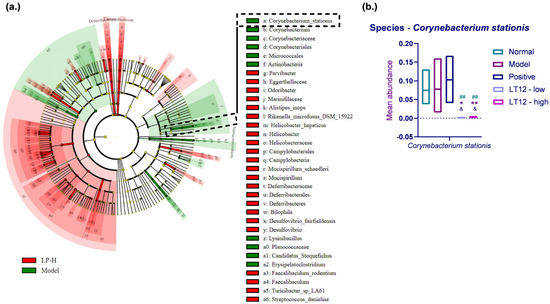 β-diversity analysis was conducted to evaluate differences in microbial composition between groups. Principal component analysis (PCA) revealed distinct clustering of the LT12-treated groups compared to the model group (Figure 7a). Heatmap analysis showed dominant phyla, including Bacteroidetes and Firmicutes, across all groups (Figure 7b). The abundance of the pathogenic strain Corynebacterium stationis was significantly reduced in both the low- and high-dose LT12 groups compared to the model group. Linear discriminant analysis (LDA) further confirmed a decrease in pathogenic strains, with no significant changes in beneficial species such as Lacticaseibacillus or Bifidobacterium (Figure 8a,b).