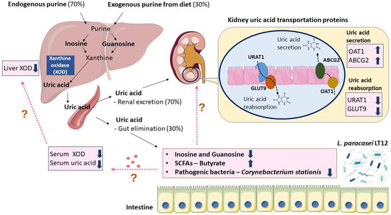 Hypothetical graphical abstract illustrating the regulation of uric acid levels by Lactobacillus paracasei LT12.