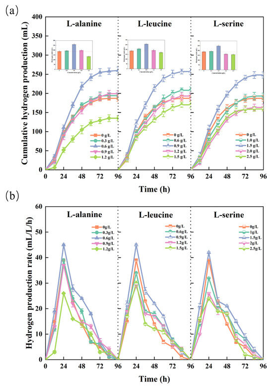 The hydrogen production rate is also an essential indicator in the evaluation of the PFHP. The higher the rate is, the more the hydrogen production will increase. It was possible to determine through experimentation that different concentrations of amino acid additives could vary the rate of hydrogen production, and the trend in rate was basically the same as that of the control group (Figure 1b). In the initial phase of PFHP, the rate increased rapidly and reached the peak value in 24 h. At this time, the rate was the fastest, and the rate of hydrogen production was the highest. After 72 h, the rate decreased to less than 10 mL/(L*h), and the photosynthetic bacteria basically stopped hydrogen production, resulting in a cease of hydrogen production at 96 h. The amino acid additive did not change the hydrogen production pattern of PFHP, but it affected the metabolic capacity of the microorganisms. When the L-alanine concentration was 0.3, 0.6, 0.9, and 1.2 g/L, the maximum rate was 39 ± 0.23 mL/(L*h), 45 ± 0.33 mL/(L*h), 37 ± 0.23 mL/(L*h), and 26 ± 0.25 mL/(L*h), respectively. When the concentration of L-leucine was 0.6, 0.9, 1.2, and 1.5 g/L, the maximum rate was 34 ± 0.21 mL/(L*h), 45 ± 0.32 mL/(L*h), 29 ± 0.26 mL/(L*h), and 30 ± 0.35 mL/(L*h), respectively. When the L-serine concentration was 1, 1.5, 2, and 2.5 g/L, the maximum rate was 32 ± 0.23 mL/(L*h), 42 ± 0.35 mL/(L*h), 26 ± 0.31 mL/(L*h), and 24 ± 0.28 mL/(L*h), respectively. When L-leucine and L-serine were added, the maximum rates of other concentrations were slower than the rate for the control group, except for the concentration with the highest hydrogen production. In summary, amino acid additives can alter the rate of hydrogen production from PFHP and thus affect the amount of hydrogen that is produced (Figure 2). However, only at the right concentration will it have a boosting effect.