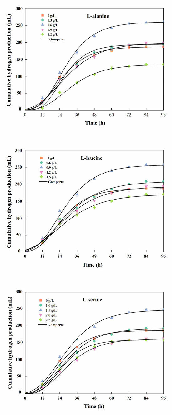 The amino acid additives (L-alanine, L-leucine, and L-serine) are able to participate in protein synthesis during anaerobic fermentation. They can all be utilized by microorganisms as carbon or nitrogen sources. In addition, they participate in the metabolism of large molecular substances such as polysaccharides and lipids. Therefore, the objective of this study was to investigate the effects of three amino acids on biological hydrogen production by photosynthetic bacteria with corn straw. Moreover, the hydrogen yield, hydrogen production rate, and energy conversion efficiency were analyzed for optimizing the concentration of amino acids that are suitable for PFHP.