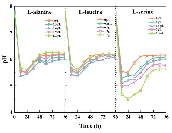 The addition of all three amino acids affects the pH value of the fermentation broth. The pH of each group was minimized when the concentration of L-alanine was 0.6 g/L and L-leucine was 0.9 g/L. The pH decreased with increasing L-serine concentrations. At 24 h, when the L-serine concentration was 2.5 g/L, the pH value could be reduced to 4.5. This phenomenon may be because the amount of L-serine that was added was too large, causing the pH of the reaction solution to be significantly lower than that of the other experimental groups. In general, L-Alanine, L-leucine, and L-serine can change the pH of a reaction solution to different degrees. Appropriate concentrations can create an acid–base environment that is suitable for microbial growth and reproduction, further promoting the operation of PFHP. However, excessive amino acid additives will destroy the acid–base balance of the reaction solution, which is not conducive to photo-fermentation.