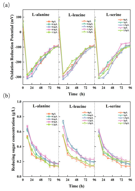 The oxidation–reduction potential (ORP) is an important parameter that represents the changes in the fermentation system, as it indicates the electron transfer during the growth and metabolism of microorganisms [44]. Figure 4a shows the graphs of the changes in the ORP of PFHP after adding different concentrations of L-alanine, L-leucine, and L-serine. It can be seen that the addition of different amino acids leads to basically the same trend of ORP change with time. Due to the ability of amino acid metabolism to generate reducing power, the ORPs of the fermentation broth with added amino acids were lower than those of the control. This facilitates microbial growth and enzyme-catalyzed reactions to take place. Since photosynthetic bacteria in the 0–12 h stage need to adapt to the new fermentation environment, and they are in the late logarithmic growth stage at this time, the growth and metabolism of photosynthetic bacteria consume significant amounts of oxidative power, and the redox potential will rapidly drop to the lowest point. During the 12–96 h stage, anaerobic fermentation consumes a large amount of energy and uses cellular reducing power to produce hydrogen, while the capacity of the system to generate oxidative power decreases, resulting in a gradual increase in redox potential. In the late stage of PFHP, with the depletion of the fermentation substrate and high concentration of metabolites, the photosynthetic bacteria gradually enter the decay phase, and cell growth metabolism basically stops, causing the ORP to continue to rebound slowly. The addition of amino acids made the ORP values lower than the control group throughout the fermentation process, and it can be concluded that L-alanine, L-leucine, and L-serine can reduce the ORP values of the reaction solution within a certain range as a way to create a more suitable environment for the growth and metabolism of photosynthetic bacteria. Most microorganisms require a suitable oxidation–reduction potential environment for growth and fermentation, and some dehydrogenase systems and iron–oxygen-reducing proteins of anaerobic microorganisms, such as photosynthetic bacteria, can remain active in a lower-ORP environment. Therefore, maintaining a low oxidation–reduction potential range during PFHP is necessary for the growth and metabolism of photosynthetic bacterial microorganisms. In general, it is important to investigate the effect of amino acids on the redox potential values of photo-fermentation biohydrogen production. It was concluded from the experiments that appropriate concentrations of L-alanine, L-leucine, and L-serine were able to reduce the redox potential of the fermentation system, thus increasing the gas production of photosynthetic biogenic hydrogen production.