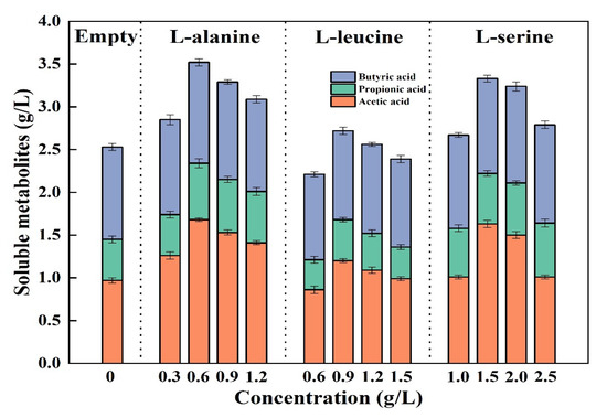 In the process of PFHP, VFAs will be produced with the degradation of corn straw. The volatile fatty acids that are produced at different concentrations of amino acid additives will also be different [47]. The volatile fatty acids that are produced by photo-fermentation mainly include acetate, propionate, and butyrate (Figure 5). In addition, acetate and butyrate were the main components. In the absence of added amino acids, the contents of acetate, propionate, and butyrate were 0.97 ± 0.03, 0.48 ± 0.04, and 1.08 ± 0.04 g/L, respectively. As the concentration of L-alanine increased, there were peaks in acetate, propionate, and butyrate. During the PFHP process, the concentration of L-alanine had the greatest influence on the acetate. When the L-alanine was 0.6 g/L, the maximum acetate content was 1.68 ± 0.02 g/L. The acetate content first increased and then decreased with the added L-leucine concentration. When the L-leucine concentration was 0.9 g/L, the acetate content in the reaction solution was the highest (1.2 ± 0.04 g/L). The changes in acetate, propionate, and butyrate contents in L-serine-added groups were tiny. The levels of acetate, propionate, and butyrate showed peaks with increasing concentrations of L-serine. When the concentration of L-serine was 1.5 g/L, the yields of acetate, propionate, and butyrate in the fermentation broth were the highest, at 1.63 ± 0.02, 0.59 ± 0.02, and 1.11 ± 0.04 g/L, respectively. From the data obtained from the experiment, it can be determined that adding L-alanine, L-leucine, and L-serine can make different changes in the content of volatile fatty acids that are produced by photo-fermentation biohydrogen production.