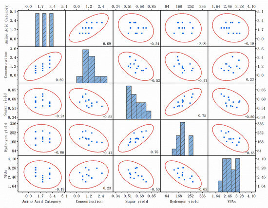 The correlations among the three different amino acid (L-alanine, L-leucine, and L-serine) concentrations and the impacts on PFHP (sugar yield, hydrogen yield, VFAs) were analyzed using scatter matrix plots, as shown in Figure 6. The sugar yield and hydrogen yield were positively correlated with a positive Pearson’s r value (0.75). This suggests that the increased saccharification of corn straw results in more reducing sugars that can participate in the PFHP process and be further converted to hydrogen. The hydrogen yield was negatively correlated with VFAs. The reason for this might be that the main substances used in the metabolism of photosynthetic bacteria to produce hydrogen were small-molecule acids. The higher the hydrogen production was, the fewer VFAs remained in the fermentation broth at the end. For the three different amino acids, which were analyzed separately, there was a high correlation between the amino acid concentration and hydrogen yield but a lower correlation between the amino acid type and some parameters such as the hydrogen yield. The reason may be because most amino acids can increase the efficiency of hydrogen production by promoting the metabolism of the substance. However, the highest yield can only be achieved at the appropriate concentration, and too high or too low a concentration can have an inhibitory effect instead [22]. This further illustrates the importance of the three amino acid additions in the PFHP process.