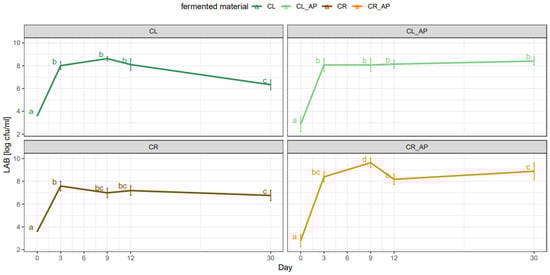 The changes in the lactic acid bacteria number during the spontaneous fermentation of sliced celeriac (CL), carrot (CR), a mix of celeriac with apple (CL_AP), and carrot with apple (CR_AP). a–d Values with different superscripts are significantly different at p ≤ 0.05.