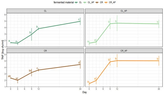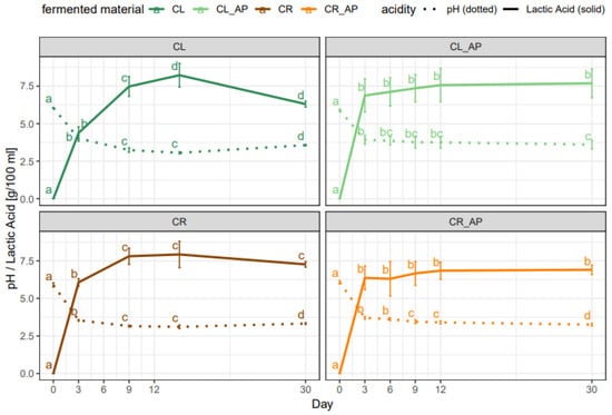 During fermentation, carbon dioxide (released by yeast and heterotrophic LAB) replaces air and provides anaerobic conditions. Most mold species that might contaminate fermented materials can grow at low pH values when oxygen is present. Therefore, it is essential to maintain anaerobic conditions in any container used for fermentation, such as a jar or barrel. Although the pH value increased significantly on the last day in vegetable silages (CR and CL), it remained below 4.2. This suggests that fungal spores were unable to develop in a properly acidified product. The slight increase in pH on the last day may have resulted from secondary fermentation, during which lactic acid is degraded, and the formation of propionic and butyric acid causes malodourous spoilage [54].