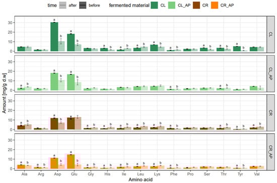Amino acid content in sliced celeriac (CL), carrot (CR), a mix of celeriac with apple (CL_AP), and carrot with apple (CR_AP) before fermentation (darker color) and after spontaneous fermentation (lighter color). The different letters (a, b) placed above the bars indicate statistically significant differences at the level of p ≤ 0.05 for the amino acid before and after fermentation. The abbreviations used are Ala—alanine; Arg—arginine; Asp—aspartic acid; Glu—glutamic acid; Gly—glycine; His—histidine; Ile—isoleucine; Leu—leucine; Lys—lysine; Phe—phenylalanine; Pro—proline; Ser—serine; Thr—threonine; Tyr—tyrosine; Val—valine.