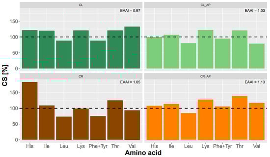The value of chemical score (CS) of spontaneously fermented products: sliced celeriac (CL), carrot (CR), celeriac mixed with apple (CL_AP), and carrot with apple (CR_AP). The dotted line represents the content of amino acids in the FAO/WHO reference protein. The Essential Amino Acid Index (EAAI) values are presented in the top right of the figure.