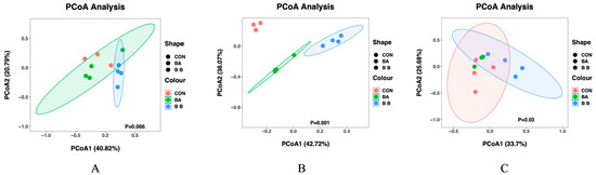Beta diversity analysis of the mixed microstorage of reed straw and residual red dates for 0 d (A), 30 d (B), and 60 d (C) of fermentation. CON: control group without the composite bacteria addition; BA: group with the addition of composite bacteria A; BB: group with the addition of composite bacteria B.
