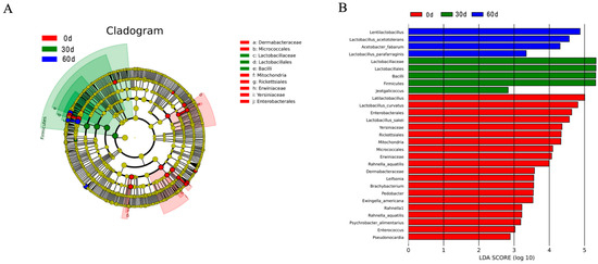 LEfSe analysis of the bacterial community in different fermentation times. Cladogram (A) shows the significantly enriched bacterial taxa from phylum to genus levels. In the histogram (B), the red color illustrates 0 days of fermentation, the green color illustrates 30 days of fermentation, and the blue color illustrates 60 days of fermentation.