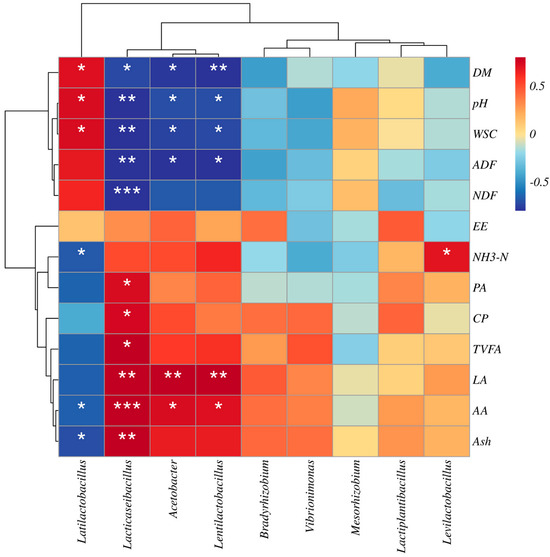 Correlation analysis between the bacterial genus and the feed nutritional composition or fermentation parameters. Note: each column represents a bacteria genus, and each row represents a feed nutritional composition or fermentation parameter. The color red means the correlation is positive, and the color blue means the correlation is negative. * indicates p ≤ 0.05; ** indicates p ≤ 0.01, and *** indicates p ≤ 0.001.