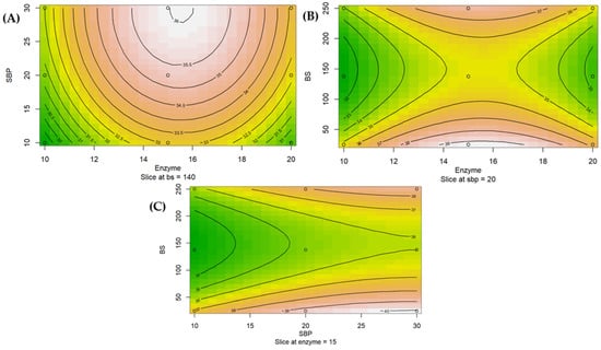To visualize the effects of these factors and their interactions on glucose yield, contour plots were generated, as shown in Figure 1. These plots provide insights into how enzyme loading, SBP concentration, and LSLB concentration interact to influence enzymatic hydrolysis efficiency.