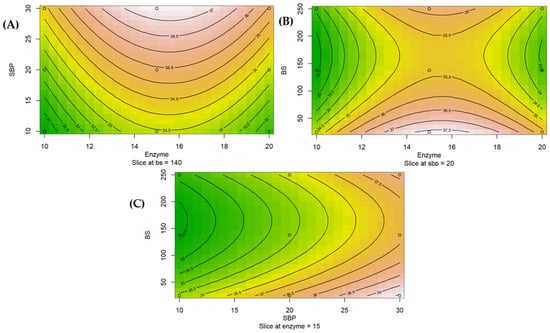 Effect of variables on glucose yield during enzymatic hydrolysis: (A) Enzyme concentration vs. soybean protein powder concentration, with a constant biosurfactant concentration of 140 mg/L; (B) enzyme loading vs. biosurfactant concentration, with a constant soybean protein concentration of 20% (w/v); (C) biosurfactant concentration vs. soybean protein powder concentration, with a constant enzyme loading of 15 FPU/g of dried cellulignin.