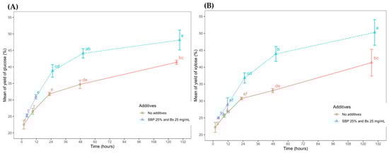Time-dependent sugar yields during enzymatic hydrolysis at 15 FPU/g of dried cellulignin. Different letters indicate statistically significant differences (p < 0.05) based on Tukey’s post hoc test. (A) Glucose yield over time with and without additives (25% SBP and 25 mg/mL biosurfactant). (B) Xylose yield over time with and without additives (25% SBP and 25 mg/mL biosurfactant).