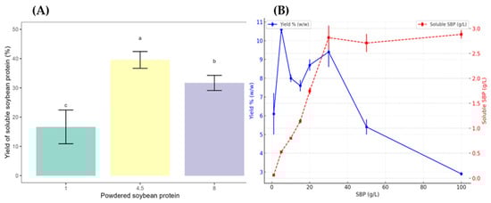 The fluctuations in yield (% w/w) at SBP concentrations below 20 g/L are due to the higher sensitivity of the yield calculation at low denominator values, where small variations in soluble protein measurements have a greater relative impact. However, the variation is not substantial, as shown by the 95% confidence intervals (e.g., 6.1% ± 1.1 at 1 g/L SBP and 9.6% ± 1.0 at 5 g/L SBP). As SBP concentration increases, the yield values stabilize, reflecting a more consistent solubility pattern. Soluble protein yield increased with SBP concentration during gentle stirring in the buffer, reaching 2.82 g/L at 30 g/L SBP. Beyond this concentration, the soluble protein levels showed minimal improvement, with yields of 2.71 g/L and 2.88 g/L at 50 g/L and 100 g/L SBP, respectively (Figure 4B). This plateau indicates limitations in protein solubility under these conditions without additional processing.