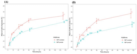 Sugar yield over time of enzymatic hydrolysis by type of soybean protein additive (cavited versus non-cavitated soybean protein): (A) glucose yield and (B) xylose yield comparing cavitated and powdered soybean protein as additives. Tukey’s post hoc test letters indicate significant differences at a 95% confidence level across hydrolysis times.