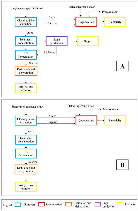 Block flow diagram for each base case of the sugarcane biorefinery scenarios: (A) CsA—1G ethanol–sugar plant; (B) CsB—1G ethanol plant. All process steam produced on cogeneration (dashed line) is used on-site.