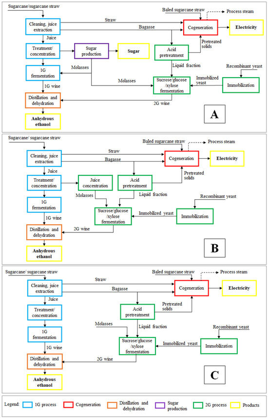 Block flow diagram for each integrated cases studies of the sugarcane biorefinery based on the 2G process of Perez et al. [32]: (A) Cs1, (B) Cs2, (C) Cs3. All process steam produced on cogeneration (dashed line) is used on-site.