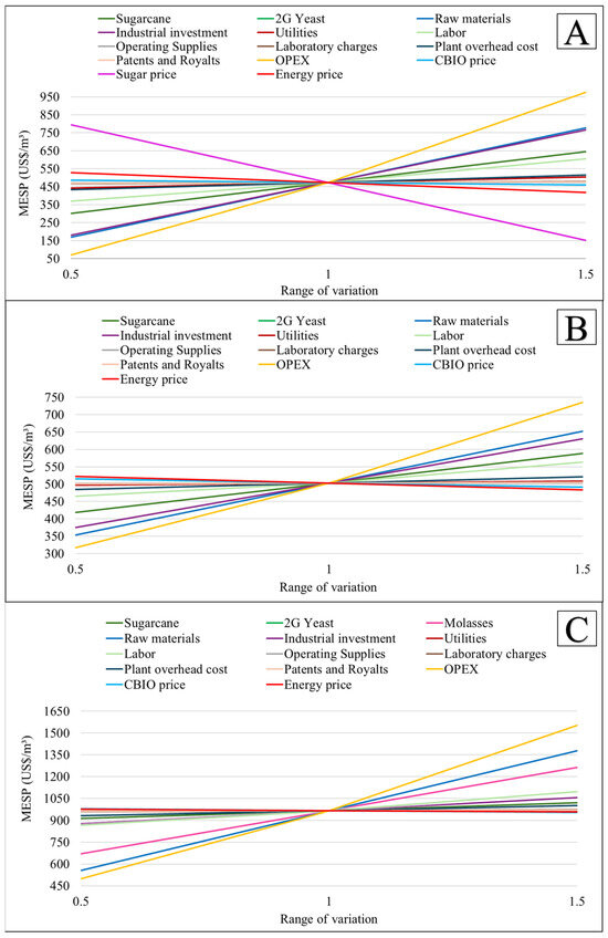 As seen in the economic sensitivity analysis of the integrated scenarios (Figure 3), the MESP is influenced by several variables with OPEX, raw materials, industrial investments, and sugarcane being the main variables that directly affect the economic feasibility of the biorefinery. OPEX has the greatest impact on MESP in the scenarios evaluated. In case study Cs1, the price of sugar is the second most influential variable on MESP, while in case study Cs3, the price of molasses is the second most influential variable. As OPEX increases, the MESP also increases because all of the costs associated with operating the biorefinery are reflected in the final price of the ethanol. Industrial investment, an important variable in the CAPEX, also has a considerable impact on MESP.