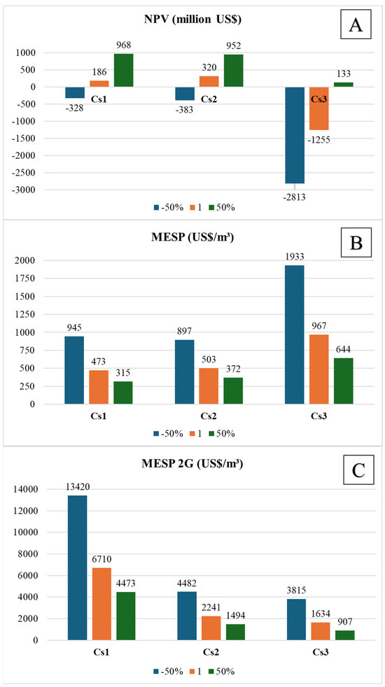 Sensitivity analysis of the economic parameters of the integrated scenarios: (A) NPV, (B) MESP, and (C) MESP 2G.