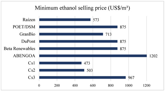 Comparing the MESP values obtained in the simulations of the integrated case studies (Cs1, Cs2, and Cs3) with six operating cellulosic ethanol plants in the world (Figure 5) (without evaluating the plant configurations, processes, and raw materials used but only examining ethanol prices in general), it can be observed that the integrated case studies Cs1 and Cs2 obtained the lowest ethanol-selling prices, while for Cs3, MESP was 13.4% higher than the average price of the operating plants (852.05 USD/m3) and 24.4% lower than ABENGOA. In relation to the Brazilian plants (Raízen and GranBio), the Cs1 case study proposed by Perez et al. [33] stands out with the lowest price of 1G2G ethanol, 17% lower than Raízen, and 34% lower than GranBio [71].