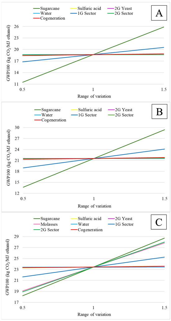 In addition to sugarcane, the 2G sector is the most important variable affecting environmental performance in the Cs3 case study. The industrial inputs used in the 2G sector are sulfuric acid, water, calcium alginate, NaOH, calcium chloride, molasses, and yeast. Sulfuric acid is used in the acid pretreatment of bagasse to release the fermentable sugars. Water is used to dissolve the sulfuric acid in the pretreatment process. Calcium alginate is used in the immobilization process to encapsulate the yeast in beads for reuse and cell protection. Calcium chloride aids in the yeast immobilization process by inducing gelation of the alginate. Sodium hydroxide is used to neutralize the acids from the pretreatment process and to adjust the pH of the medium prior to the fermentation process. Recombinant yeasts are the essential microorganisms for the conversion of sugars to ethanol. Molasses are one of the main carbon sources for yeast in fermentation and is purchased in large quantities in this case study. Therefore, all impacts related to molasses (from sugarcane cultivation to transportation to the biorefinery) contributed to the increase in the environmental impact of ethanol production, mainly in the 2G sector (Figure 6C) compared to the other case study.
