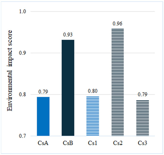 The comparison of case studies in research is often not a straightforward task but is necessary to identify patterns, evaluate outcomes, or select the most appropriate approach for a given context. In LCA, however, environmental parameters are inherently diverse, often using different units, scales, and data. This diversity makes direct comparisons difficult. To address this, researchers and analysts often develop a single metric value that is normalized to a range between 0 and 1. A 0 to 1 metric provides a standardized range, making it easier to directly compare different datasets without having to interpret complex units or scales. In this context, an environmental impact score ranging between 0 and 1 was created based on Julio et al. [65] to facilitate comparison between scenarios by combining the different environmental impacts into a single metric. It provides a clear, interpretable scale, where 1 represents the least favorable outcome (the worst environmental performance), and 0 represents the most favorable (the best environmental performance). The highest value in each environmental indicator was considered equal to 1, and the remaining values were calculated proportionally to this value. This approach facilitates objective evaluation, ensures consistency across diverse datasets, and enhances the clarity of results. The normalized values () were multiplied by the weighting factor of each environmental indicator (). The final score (τ) is the result of the sum of (), shown in Equation (3).