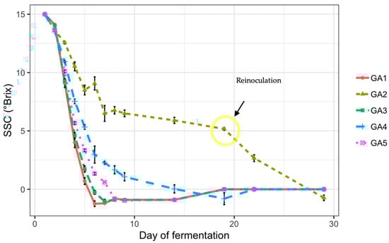 SSC changes during fermentation of five apple and grape pomace-based fermentations: a purely grape pomace-based treatment [GA1 (1:0)], a purely apple pomace-based treatment [GA2 (0:1)], a predominantly grape pomace-based treatment [GA3 (3:1)], a predominantly apple-based pomace treatment [GA4 (1:3)], and an evenly weighted apple and grape pomace-based treatment [GA5 (1:1)]. The yellow circle indicates the yeast and nutrient reinoculation time for GA2. SSC represents soluble solid content. The bars indicate the standard deviation of means (n = 3).
