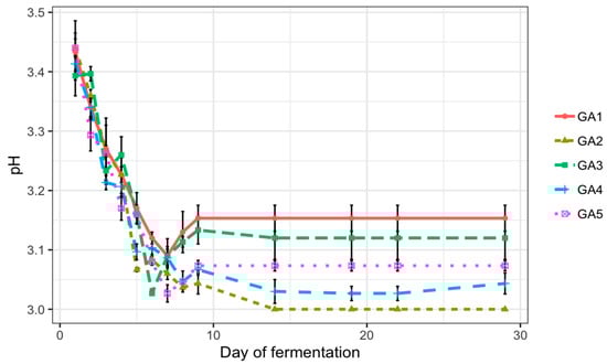From the pH dynamic changes (Figure 2), there was a similar sharp dropping trend from the initial pH of 3.45 to the pH of approximately 3.1 on Day 7 detected in all of the fermenters. After Day 7, pH values in GA1 to GA5 separated, ending with a pH range from 3.15 to 3.0 on Day 29; this was also correlated with the pomace types. The more grape pomace present in the must, the higher the pH in the final products. The decreasing pH during fermentation may be due to the production of acids and the rapid sugar and nutrient consumption by yeast.