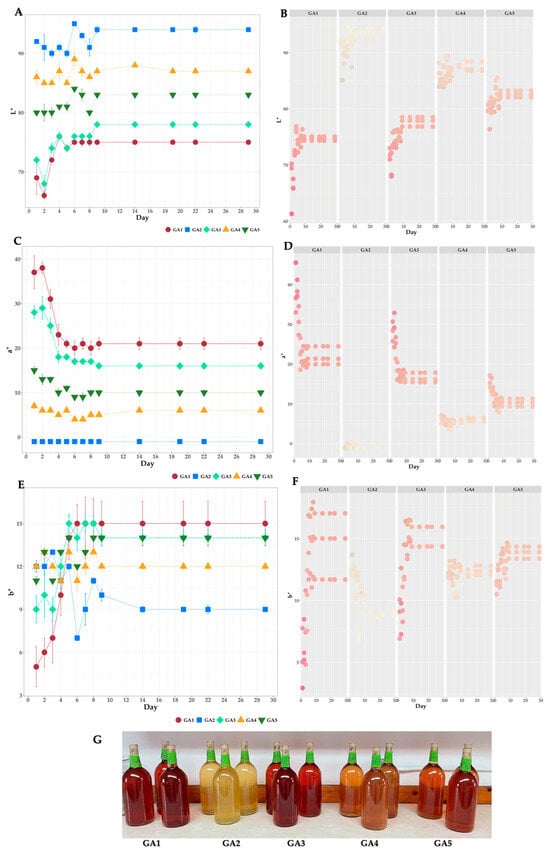 Line chart (A) and plot depicting daily sample color (B) for fermenting must lightness (L*) values, line chart (C) and plot depicting daily sample color (D) for fermenting must red/green values (a*), line chart (E) and plot depicting daily sample color (F) for fermenting must blue/yellow (b*) value changes during fermentation, bottled fermented products in 1.5 L vessels (G) for five apple and grape pomace-based fermentations: a purely grape pomace-based treatment [GA1 (1:0)], a purely apple pomace-based treatment [GA2 (0:1)], a predominantly grape pomace-based treatment [GA3 (3:1)], a predominantly apple-based pomace treatment [GA4 (1:3)], and an evenly weighted apple and grape pomace-based treatment [GA5 (1:1)].
