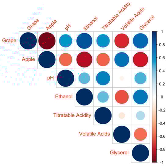 To confirm the correlation relationship between wine characteristics and fermentation materials, the correlation matrix plot (Figure 4) was created. Corresponding to the statistical analysis (Table 4), grape pomace amounts were highly correlated with ethanol and glycerol amounts with high correlation values (~0.8). Apple pomace amounts were highly correlated (~0.7) with volatile acids.